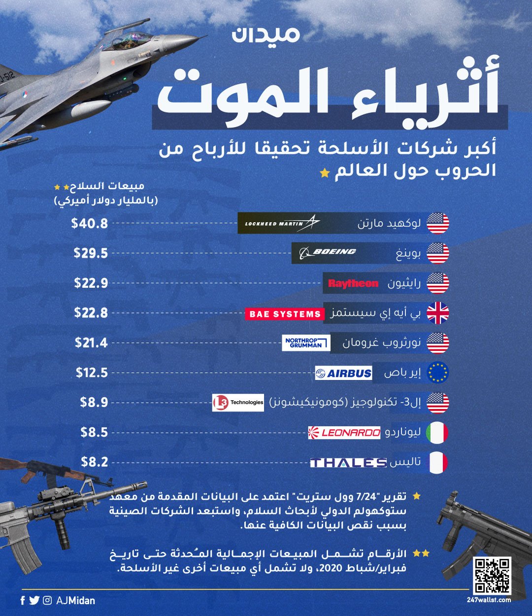 "مصائب قوم عند قوم فوائد".. فعلى ركام الحروب والدمار يوجد ثلة من المستفيدين من هذا الوضع، وهي شركات السلاح، حيث يُضَخ في جيوبها مليارات من الدولارات، إليكم مجموعة من اكبر شركات الأسلحة في العالم..