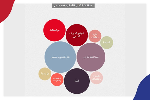 سجّل مجال الغاز الطبيعي والمحاجرالنسبة الأعلى من مجموع قضايا التحكيم المرفوعة ضد مصر بعد عام 2011 بواقع 23 في المئة، تلاه قطاعا البناء والصرف الصحي بنسبة 15 و11 في المئة لكل منهما.